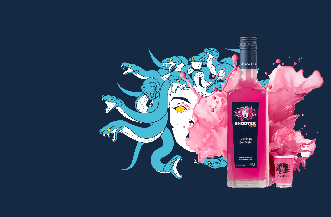 Shooter est né en 2021 à Agen, c’est le plaisir maison à partager entre amis. Des shooters au goût bonbon qui rendent vos soirées endiablées ! Inspirés par le mythe de Médusa, ils sont envoûtants et inoubliables. Avec Shooter, vivez le rêve,shot après shot !